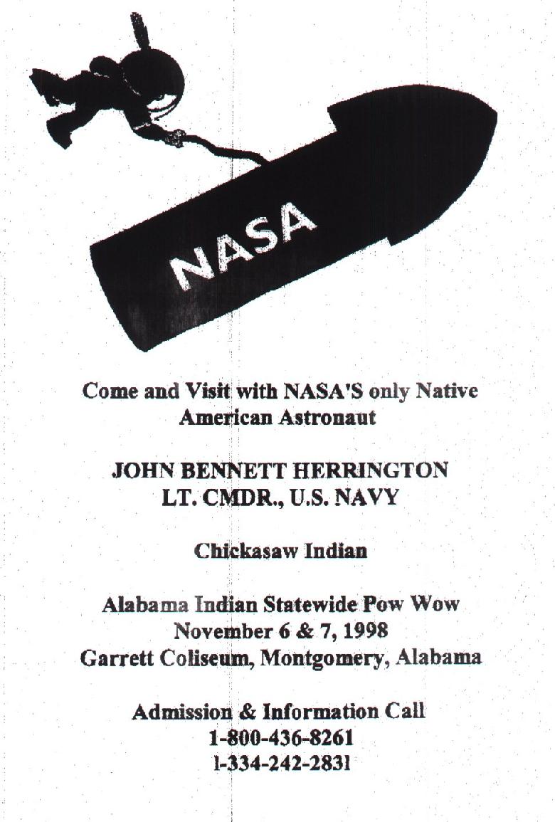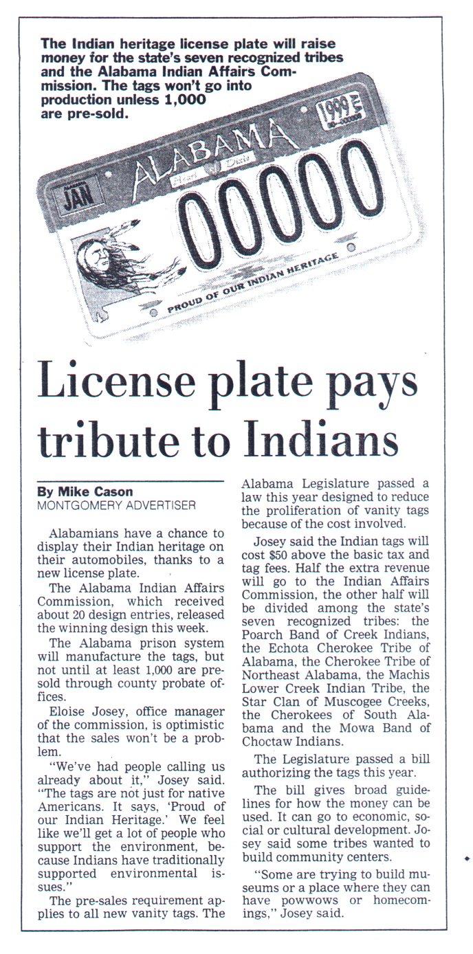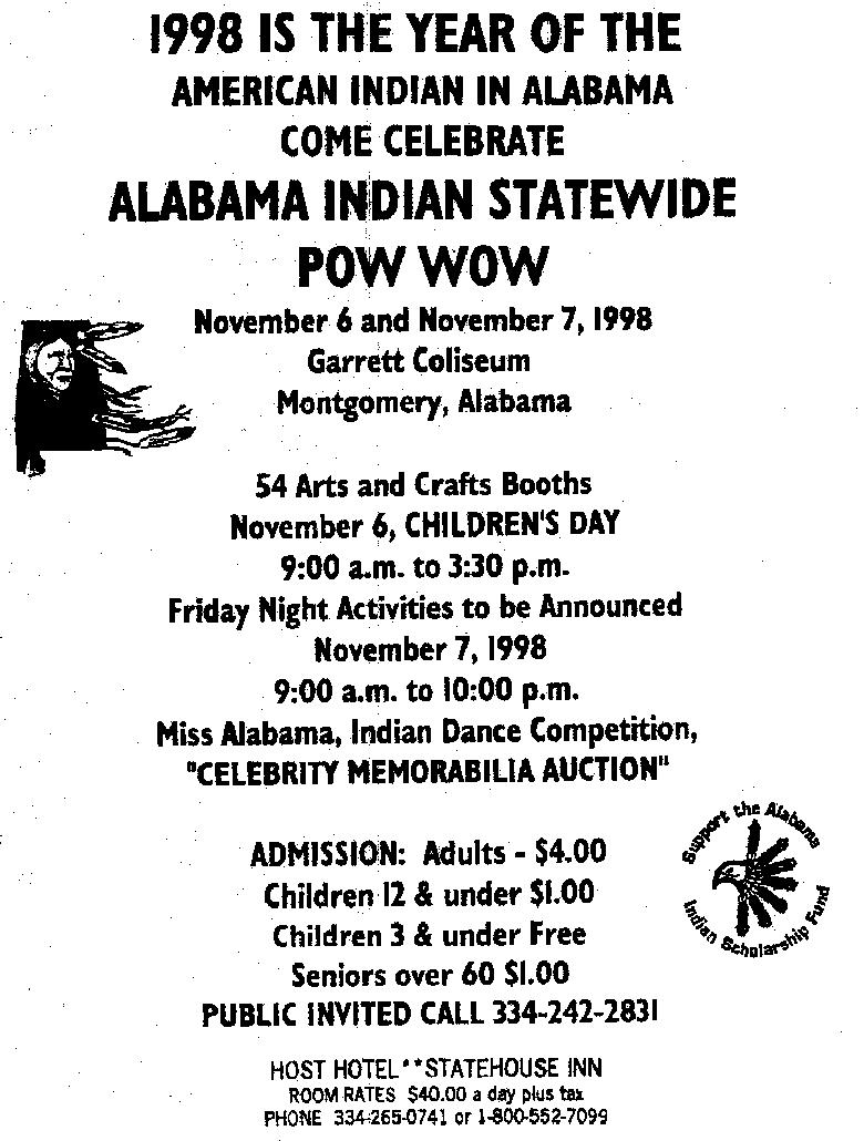 The Year of the American Indian in Alabama celebrates the culture and heritage of Native Americans by recognizing excellent events, programs and exhibits held during 1998. Alabama's state-recognized tribes, museums and other historical and cultural agencies joined together with the Alabama Indian Affairs Commission, compiling this calendar of events. To Help our state's disadvantaged Native American students, many organizations will donate money from their events to the Alabama Indian Scholarship Fund.