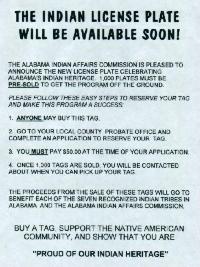 The Year of the American Indian in Alabama celebrates the culture and heritage of Native Americans by recognizing excellent events, programs and exhibits held during 1998. Alabama's state-recognized tribes, museums and other historical and cultural agencies joined together with the Alabama Indian Affairs Commission, compiling this calendar of events. To Help our state's disadvantaged Native American students, many organizations will donate money from their events to the Alabama Indian Scholarship Fund.