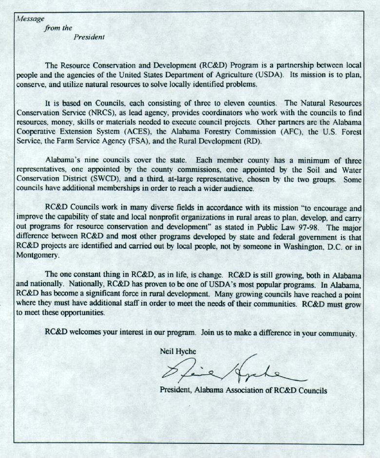 - Provide a focal point and a unified voice for RC&D in Alabama.