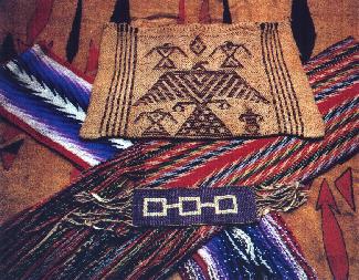 (left) Collage of Ela White's weaving on an elkskin painted by John: twined "panel bag" ( made of wi-ka-pi and buffalo wool cordage, the top was closed by lacing the rim tightly together ) with thunderbird