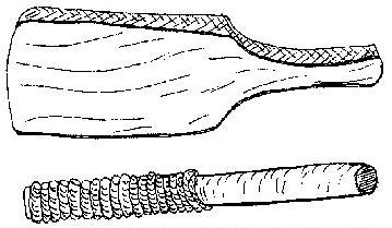 Tools used for shaping and decorating pottery by Illiniwek potters: paddle and cord-wrapped stick.
