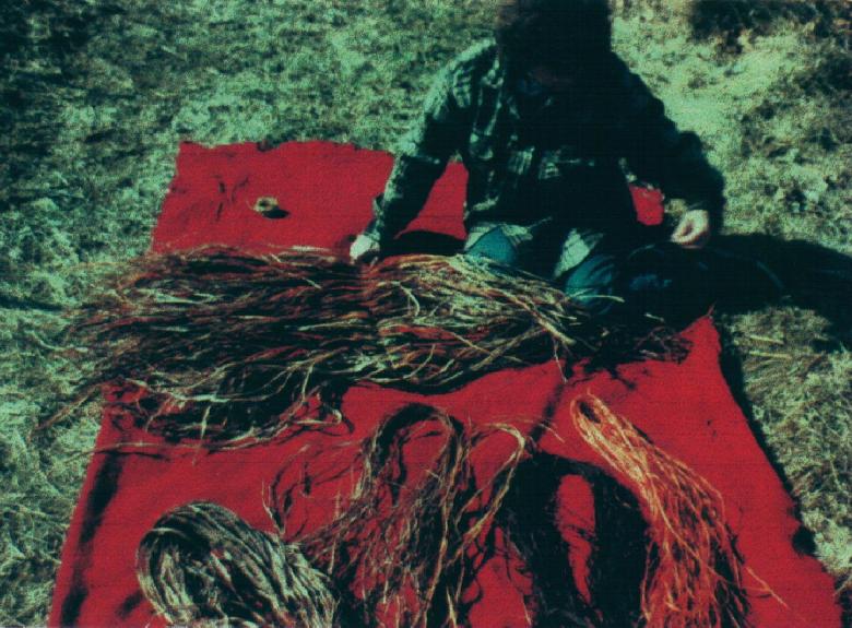 | Ela collects roots of bloodroot in the fall. These are the source of orange/red dye on this bullrush mat. |
