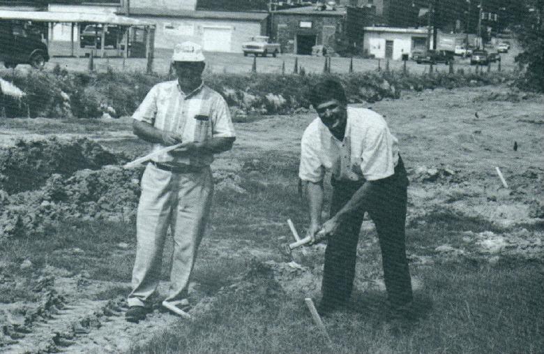 NRCS Regional Engineer Lee Greene and Flint Creek Watershed Coordinator Brad Bole stake out the urban constructed wetland sites at the Hartselle Environmental Park.
